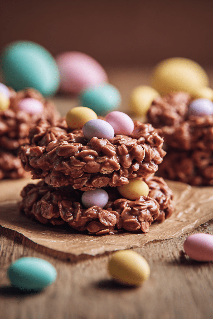 These chocolate Easter no bake cookies are soft, chewy, and topped with pastel candy eggs for the perfect festive touch.