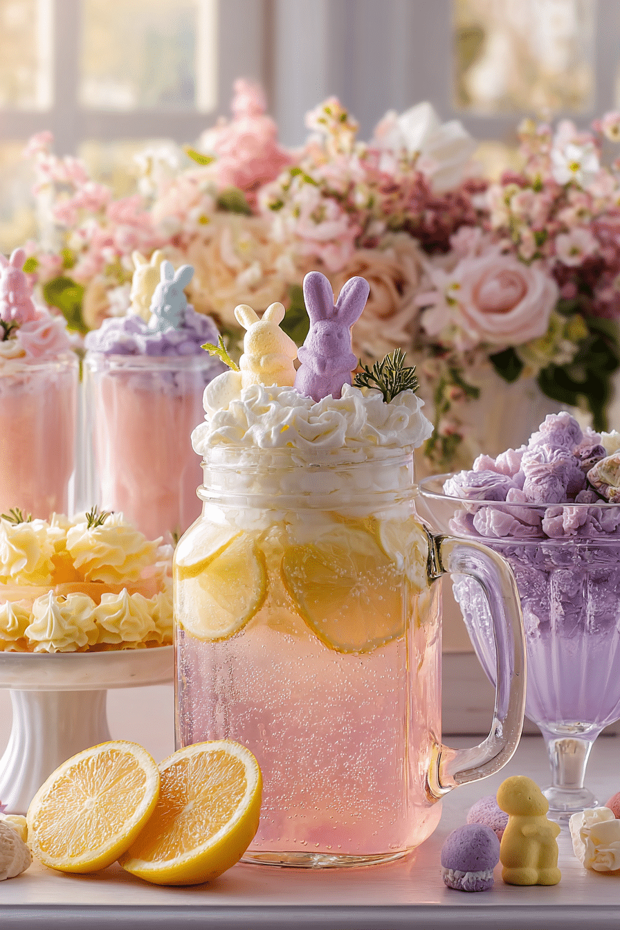 A customizable Easter drink station featuring pastel beverages, fresh fruit garnishes, and mix-and-match options for guests of all ages.