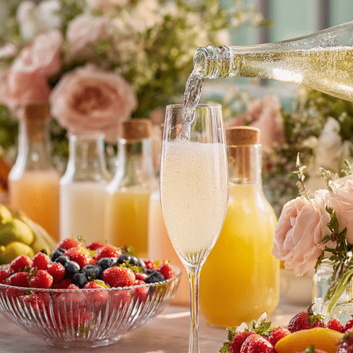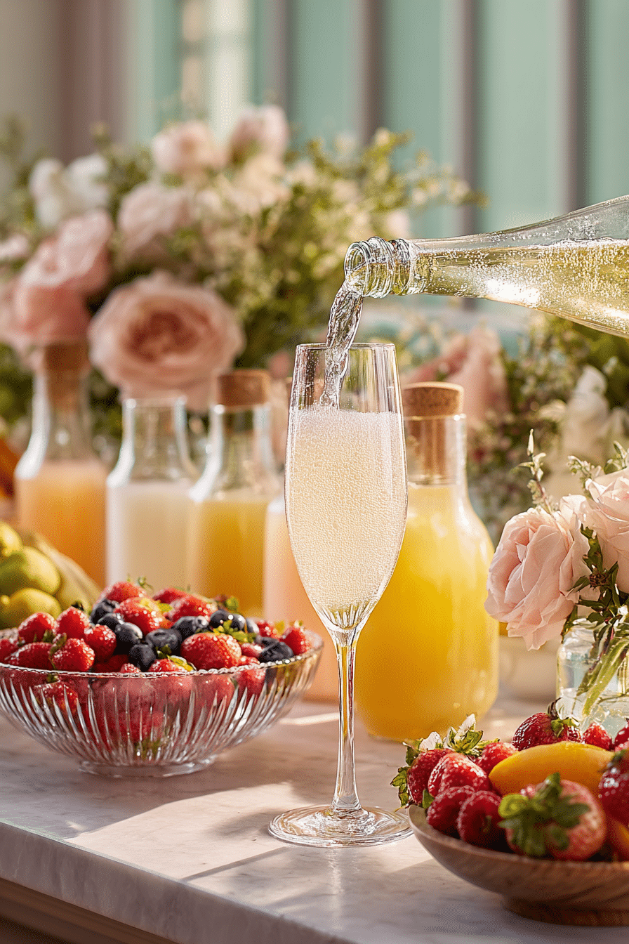 A DIY mimosa bar with prosecco, assorted juices, and fresh fruit for a fun and customizable Easter brunch drink station.
