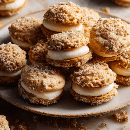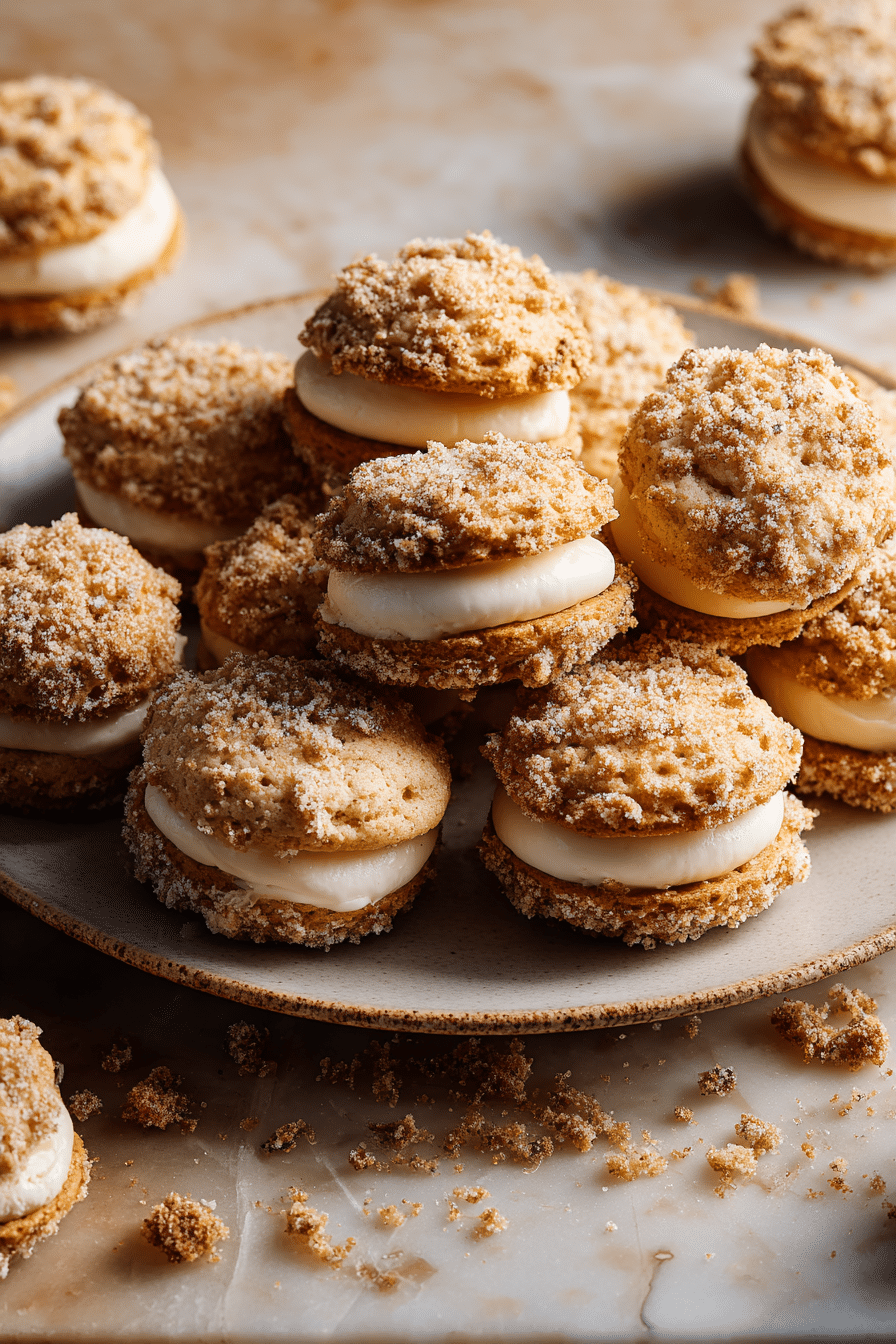 - Spread or pipe cream onto the plain cookies, then top with the crumb-coated cookies to form sandwiches.