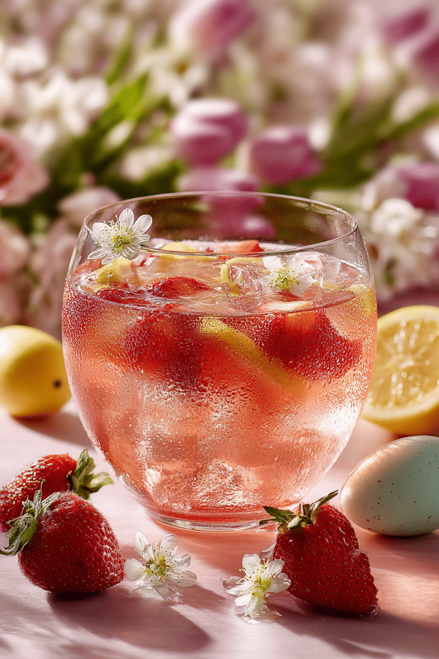 A sparkling strawberry lemonade punch with fresh berries and citrus, perfect for Easter party celebrations.